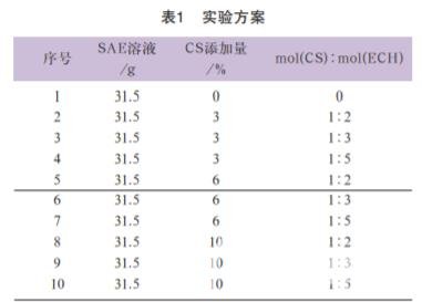 SAE溶液原液的固含量為31.75%,每次實(shí)驗(yàn)均使 用絕干質(zhì)量為10g的S A E,即溶液質(zhì)量31.50g。分別配 制不同質(zhì)量百分比的C S和不同摩爾質(zhì)量比的E C H與 S A E反應(yīng)制得改性施膠劑,C S質(zhì)量均為S A E溶液絕干 質(zhì)量的3%、6%、10%,C S與E C H的摩爾質(zhì)量分?jǐn)?shù)比分 別為1∶2、1∶3、1∶5。具體方案設(shè)計如表1所示。