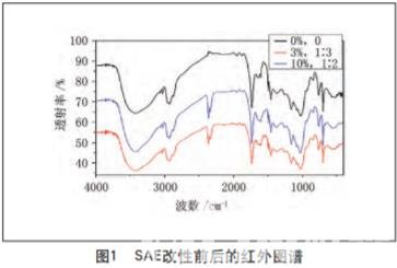 圖 1中 分 別 是 添 加 C S 量 為 0 % 、3 % 、1 0 % , 并且添加 E C H為 0、m o l (C S)∶m o l (E C H )=1∶2、 mol(CS)∶mol(ECH)=1∶3的紅外圖譜。無CS和ECH添 加的樣品,即改性前實(shí)驗(yàn)室制備的S A E乳液。通過對比 分析,改性前后的聚合物紅外圖譜基本一致,即改性前 后的聚合物功能基團(tuán)一致。C S中含有胺基(-N H2), S A E中含有叔胺,E C H作為交聯(lián)劑易與胺基(-N H2) 和叔胺發(fā)生交聯(lián)反應(yīng)、季胺化反應(yīng),生成了叔胺和季銨 鹽。改性后的聚合物圖譜中沒有出現(xiàn)C S的-N H2振動 峰,環(huán)氧基團(tuán)也不存在振動峰。圖譜結(jié)果基本能表明 CS、ECH都和基體SAE發(fā)生了交聯(lián)反應(yīng)。 2.2 乳液的基本物性 改性后乳液固含量測定后,通過計算,使用蒸餾水 將所有乳液的固含量統(tǒng)一調(diào)制成為31.75%,對調(diào)制后 的乳液進(jìn)行pH值、黏度檢測,結(jié)果如表2所示。 與原S A E相比,改性后表面施膠劑的p H值、黏度 稍有增加。這與聚合物改性引入胺基、生成叔胺和季 胺,生成網(wǎng)狀聚合物有關(guān)。結(jié)果表明改性后的乳液p H 值、黏度變化不顯著。