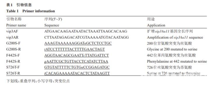 根據 vip3Aa11 基因(GenBank No. AAR36859) 全長序列,通過 DNAMan 7.0 設計定點突變引物, 引物設計包含5'端重疊區和3'端延伸區;除突變位 點外,引物長度大約25~30 bp,5'端重疊區包含15~ 20 bp,3'端延伸區包含至少10 bp?突變位點位于2 條引物上,分別位于正向突變引物重疊區下游?緊 鄰重疊區和反向突變引物 5'端?引物由上海生工 生物工程技術服務有限公司合成。