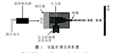 電壓式噴墨機臺是在噴嘴中裝上壓電材料,當 壓電材料接收到噴墨信號時,壓電材料會膨脹變形,擠壓墨水使墨滴從噴頭中噴出形成微滴推出噴印在 織物上,見圖1。