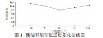 在料液比 10 ∶ 40(mL /mL)、抽提時間 8 h 的 條件下,由圖 1 可知:溫度升高可以提升油脂的萃 取率,降低殘油率。但當(dāng)溫度達到 80℃時,殘油 率不再降低,這可能由于 80℃達到了蛋白質(zhì)變性 的臨界溫度,溫度繼續(xù)升高蛋白質(zhì)開始變性,火麻 油不飽和脂肪酸氧化增加,分子增大,水溶性降低, 導(dǎo)致萃取率降低,故 80℃為較優(yōu)水平。