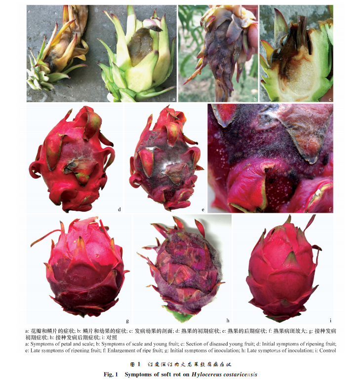 對健康的紅皮 深 紅 肉 火 龍 果 果 實 進 行 接 種,以 無菌的 PDA 為對照,5d后針刺傷接種的果實全部 發(fā)病,接種產(chǎn)生的癥狀與田間發(fā)病的癥狀相同(圖 1g~h),而對照果實不發(fā)?。▓D1i)。對發(fā)病組織進 行再分離,可得到與原分離株相同的病原菌,符合柯 赫氏法則,證明接種菌為火龍果軟腐病的致病菌。