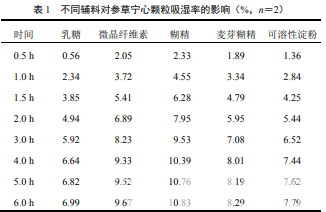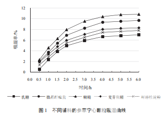 選取制粒常用輔料乳糖、可溶性淀粉、微晶纖維 素、麥芽糊精、糊精,分別與浸膏粉按 1∶1 比例混 勻,干法制粒(送料速度 30 r/min、滾輪轉(zhuǎn)速 4 r/min、 滾輪壓力 60 MPa),并按“2.2.1”項下方法測定所制 顆粒的吸濕率,繪制吸濕曲線,結(jié)果見表 1、圖 1。