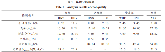 共選用 7 個(gè)煤種,包括 2 種煙煤、2 種無(wú)煙煤、2 種蜂窩煤和 1 種型煤。2 種煙煤分別來(lái)自河 南平頂山七礦(HNY)和陜西鴻海物流有限責(zé)任公司(HHY);2 種無(wú)煙煤分別來(lái)自平頂山天安煤業(yè)股份 有限公司(HNW)和山西晉城無(wú)煙煤礦業(yè)集團(tuán)有限責(zé)任公司(JCW);2 種蜂窩煤分別來(lái)自武漢市售蜂窩 煤(WHF)和河南安陽(yáng)蜂窩煤(HNF);型煤為陜西榆林煤球(YLX)。7 個(gè)煤種的煤質(zhì)分析見(jiàn)表 1。表 1 中 煙煤和無(wú)煙煤的數(shù)據(jù)由煤種供應(yīng)方提供,蜂窩煤和型煤數(shù)據(jù)按照GB/T 212—2008《煤的工業(yè)分析方法》[6] 和 GB/T 213—2008《煤的發(fā)熱量測(cè)定方法》[7]的規(guī)定測(cè)定。