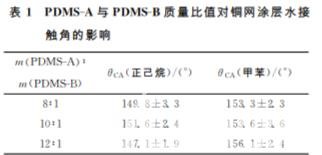 表1 PDMS-A與 PDMS-B質量比值對銅網涂層水接 觸角的影響 m(PDMS-A)∶ m(PDMS-B) θCA(正己烷)/(°) θCA(甲苯)/(°) 8∶1 149.8±3.3 153.3±2.3 10∶1 151.6±2.4 153.6±3.6 12∶1 147.1±1.9 156.1±2.4   Sylgard184包含兩個組分,其中 PDMS-A 溶液為乙烯基封端的 PDMS,PDMS-B為甲基氫基硅氧 烷共聚物、含鉑催化劑、抑制劑所組成的固化劑。不同的 PDMS-A 與 PDMS-B配比影響 PDMS的固化 速率與固化程度,進而影響粒子的運動能力,因而影響成膜情況及涂層表面接觸角。另一方面,在成膜 過程中,溶劑的揮發速率也能影響粒子的運動,從而對膜的表面形貌及粗糙度造成影響。因此我們首先固定浸涂液組分為2.5gPDMS與3.125gSiO2,將 兩者溶解在50mL正己烷或甲苯溶液中,銅網在浸涂 液 中 的 浸 泡 時 間 為 5 min,銅 網 的 提 拉 速 度 為 0.05mm/s,涂層的固化溫度為80℃。改變PDMS-A 與 PDMS-B 的 質 量 比,考察其對銅網涂層水接觸 角 (θCA)的影響,同時比較溶劑正己烷與甲苯對成膜后水 接觸角的影響。其結果見表1。