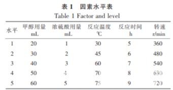 固定小球藻藻粉的質(zhì)量為 5 g, 選取甲醇用 量、催化劑(濃硫酸)用量、反應(yīng)溫度、反應(yīng)時間和 攪拌速度為試驗(yàn)因素,每個因素考察 5 個水平,采 用 L25(56 )正交試驗(yàn)表設(shè)計正交試驗(yàn),分析比較不 同條件下小球藻生物柴油的產(chǎn)率。 表 1 為因素水 平表。