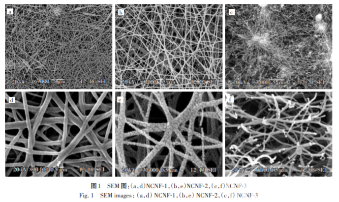 圖1為NCNFs的SEM圖。由圖1(a)和圖1(b) 可以看出,纖維的表面光滑,纖維的直徑大小比較 均一,平均直徑為 160 nm,纖維未出現(xiàn)珠結(jié)狀結(jié)構(gòu),說明質(zhì)量分數(shù)8%的PAN紡絲溶液可紡程度較 高。圖1(c)和圖1(d)是PAN/PVP(PAN和PVP的質(zhì)量比為2∶1)基NCNFs,纖維的平均直徑為150 nm, 與只加入PAN的溶液相比,纖維變得粗糙,表面出 現(xiàn)大量的裂紋和孔隙,主要是由于PVP 在高溫下 分解產(chǎn)生大量的CO2和CO等氣體,使得纖維上產(chǎn) 生裂紋和孔隙。圖1(c)和圖1(d)中還可以看到少 量斷裂的纖維,說明產(chǎn)生的裂紋和孔隙還影響 了纖維的脆性,使得纖維變得容易斷裂。圖1(e) 和圖1(f)是KOH活化處理后的NCNFs,纖維變得 彎曲緊密和粗糙,并且大量的斷裂,很難維持纖維 原有的形貌。主要是由于KOH的處理過程中與碳 纖維發(fā)生氧化還原反應(yīng),拓展了因加入 PVP 后 NCNFs 形成的孔洞,少量的 K 單質(zhì)插入碳層中使 得碳層膨脹,導(dǎo)致NCNFs 的纖維出現(xiàn)大量斷裂的現(xiàn)象。
