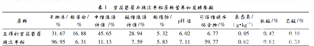 第三茬盛花期三得利紫花苜蓿,采自新疆阿克蘇 地區溫宿縣沙河鎮第一師五團試驗田( N 41°17'38. 1″、 E 80°47'38. 2″) ,含水量為 72%左右,粉碎至 1 ~ 2 cm, 備用。 殘次駿棗,新疆阿拉爾市豐之源紅棗加工廠提 供,剔除發霉和變質的駿棗,帶核干燥( 65 ℃ ) 至含水 量在 10%以下,粉碎,備用; 經檢測黃曲霉毒素和黃 曲霉毒素含量分別為 9. 77 μg / kg 和 2. 97 μg / kg,均 未超 過《飼 料 中 黃 曲 霉 毒 素 B1 的 測 定》( GB /T 17480—2008) 標準。紫花苜蓿與殘次棗粉原料營養 和發酵參數見表 1。