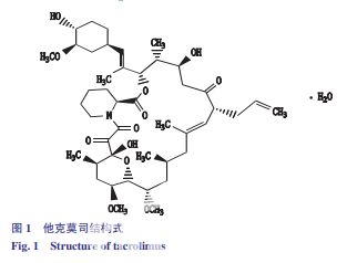 他 克 莫 司(tacrolimus)為 17- 烯丙基 -1,14- 二羥基 -12-[2-(4- 羥 -3- 甲氧基環己基)-1- 甲 基乙烯基]-23,25- 二甲氧基 -13,19,21,27- 四甲 基 -11,28- 二 噁 -4- 氮 雜 環[22.3.1.04,9]二 十 八 烷 -18- 烯 -2,3,10,16- 四 酮 一 水 合 物,結 構 式 見 圖 1。相對分子質量 822.02,按 無 水 物 計 算,含 C44H69NO12(他克莫司與異構體I、異構體II之和)應為 98.0% ~102.0%。