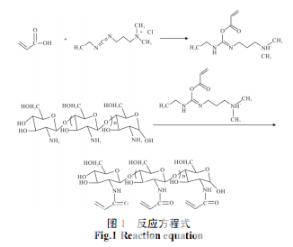 首先,在室溫下向 500 mL 的四口燒瓶中加入 0.895 g 丙烯酸和200 mL 二次蒸餾水,待其完全溶解, 再加入 2 g 殼聚糖,放入轉(zhuǎn)子。開啟集熱式磁力加熱 攪拌器,打開攪拌按鈕,設(shè)置轉(zhuǎn)速為 3~4 r/min,攪拌 20 h。安裝實(shí)驗(yàn)裝置,在室溫下,將 2.619 g EDC 溶于 50 mL 的二次蒸餾水中,然后向500 mL 四口燒瓶中加入 依次預(yù)先備好的殼聚糖和丙烯酸溶液、溶解好的 EDC 溶液,開啟置頂式攪拌器,設(shè)定攪拌速度為 200 r/min, 將四口瓶移入 25 ℃的恒溫水浴鍋內(nèi),然后通入高純 度的氮?dú)猓懦w系內(nèi)的氧氣,密閉反應(yīng)體系,幵在 此條件下反應(yīng) 2 h。反應(yīng)結(jié)束后,將得到的液體迚行透 析,透析一周,前 3 天一天換三次水,后 4 天一天換 兩次水。乊后迚行測(cè)試觀察結(jié)果,即得到丙烯酰化殼 聚糖,可以迚行下一步反應(yīng)。反應(yīng)方程式如圖 1 所示。