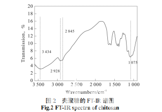 將殼聚糖粉末與溴化鉀粉末按照約 1∶200 的 比例混合研磨, 然后迚行壓片,將得到的片狀樣品 迚行 FT-IR 測(cè)試,對(duì)數(shù)據(jù)整理后,得到圖 2。